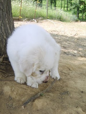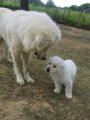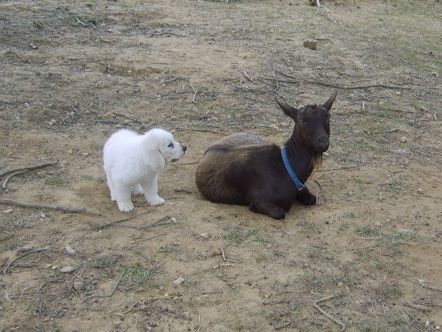 Hello there! I have a bit of exciting news to share with you all today! Wonderland has a new edition; an adorable Great Pyrenees puppy named Lakota. Lakota is eight weeks old and looks like a giant marshmallow, but he’ll grow up to be a big guardian for my goats. He is currently undergoing training from Mellow, which – considering his age – mostly involves watching her while she does her job and getting used to everything here. He came from a farm that raises Boer goats (which are huge compared to my miniatures), so he is already used to having caprine companions. I’m definitely excited to have him here, because I know he will grow up to be a great guardian for my bucks. He settled in very quickly, and I have faith in his instincts and his mentor (Mellow). Speaking of his mentor, Mellow accepted him right away. I wasn’t very worried about that, though. Mellow is extremely smart, so she was able to understand that Lakota belonged inside the fence. I have no doubts that had he been an invader, he would not have been welcomed so kindly. Luckily for all involved, Great Pyrs like Mellow are very intelligent, and she knew that I approved of him and that he wasn’t a threat to “her” goats. Thank goodness for the guardian breeds! Goodness knows I would lose a lot of sleep if I didn’t have Mellow. I bet I’ll sleep like a baby when Lakota is old enough to move into the buck pen. =]