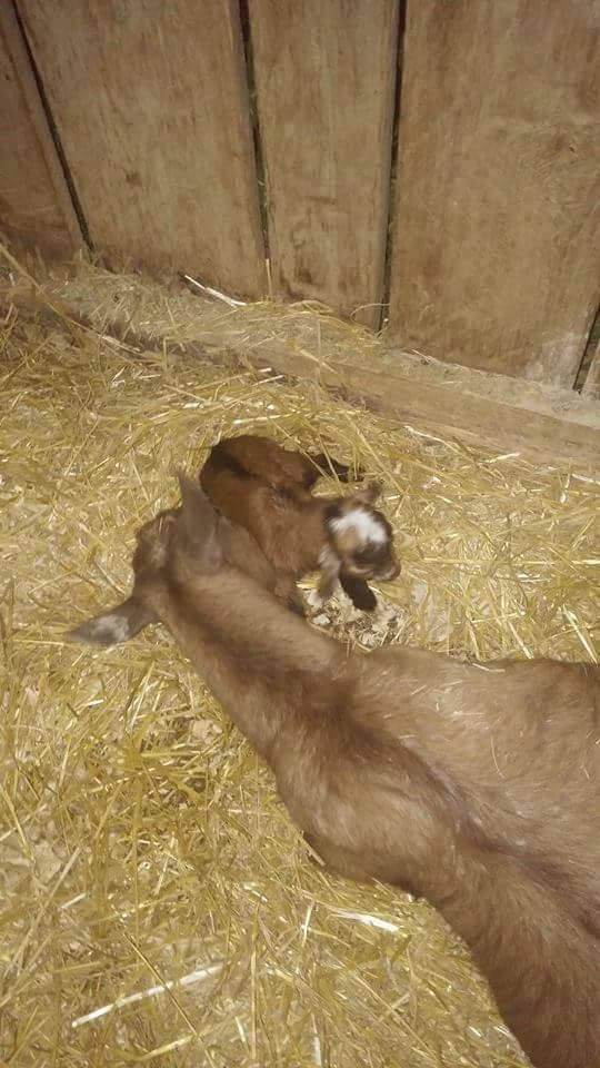 Well, this will be a short tale. Brownie has always been a very stoic, sneaky doe when it comes to giving birth. The first couple of times she did so, I missed it all together. The second time she gave birth, my dad and I checked her before leaving to get lunch at Taco Bell, which is roughly 10-15 minutes away from us. When we came back, she had twin bucklings all dried off and ready to go.