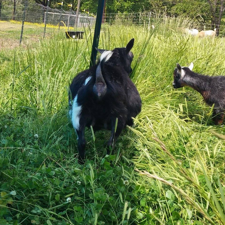 Joy is a black goat with minimal white, so genetically speaking she is only able to pass on black (or, very rarely, recessive red) and her white patches to her kids. That may sound boring, so if you’re wondering what could possibly be so interesting about a goat who can only pass on the gene for black, let me explain: